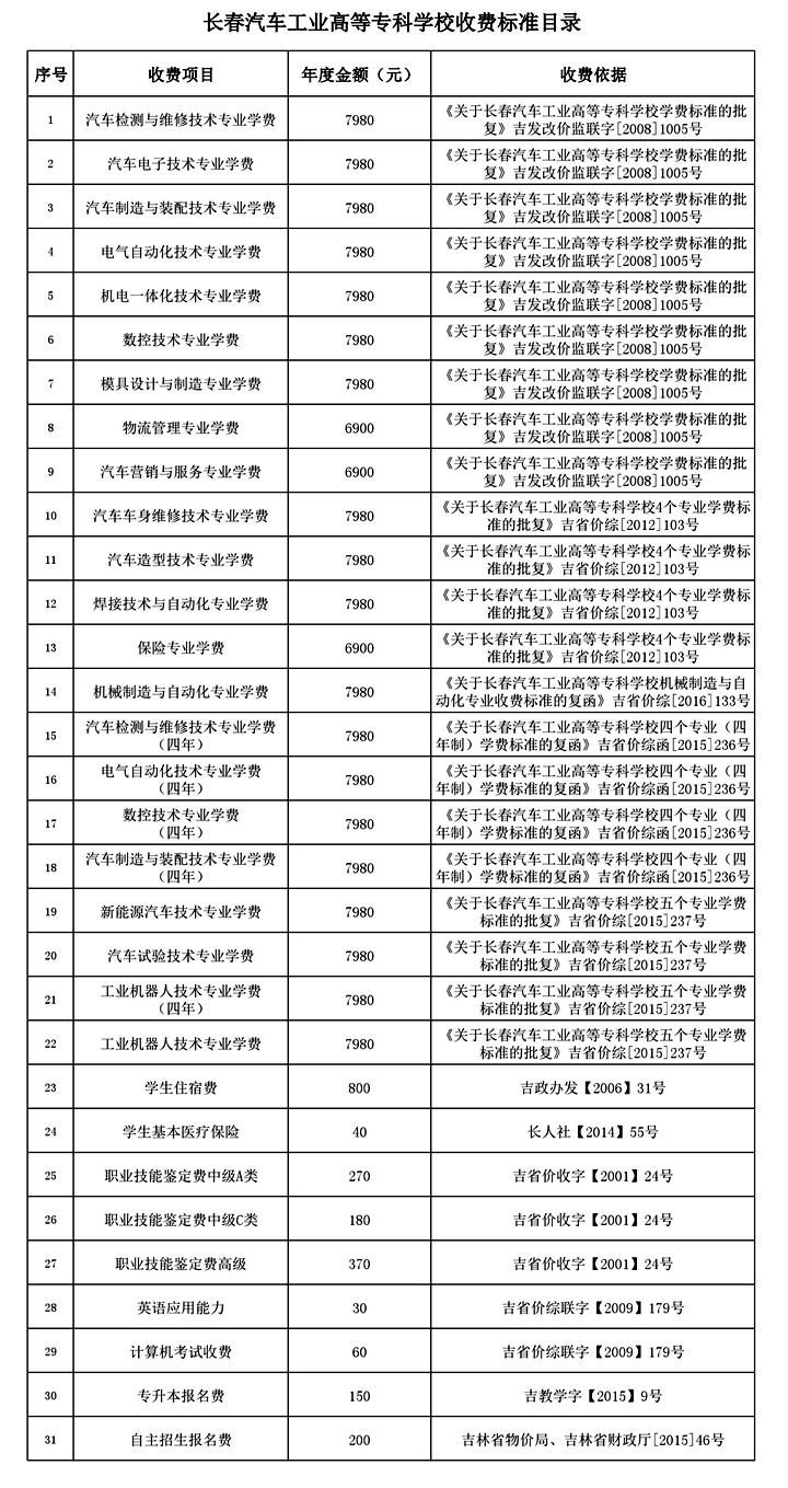 长春汽车工业高等专科学校收费标准目录